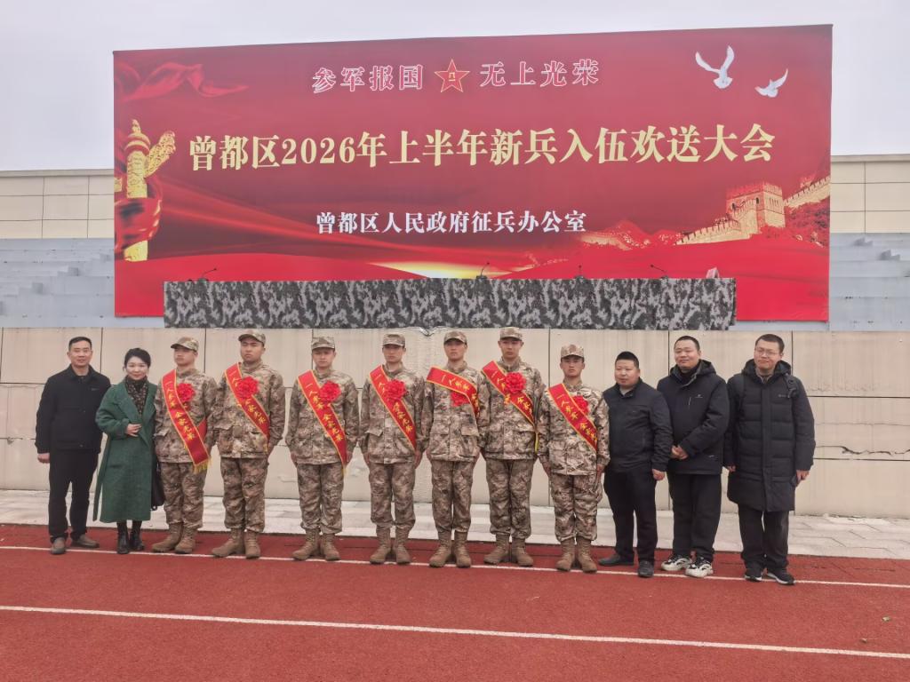 3月19日上午,曾都区2026年上半年新兵入伍欢送仪式在庄重而热烈的氛围中隆重举行。随州职业技术学院武装部工作人员及教师代表出席仪式,共同见证这一光荣时刻,为即将踏上军旅征程的新兵们送上最诚挚的祝福与最深切的期许。